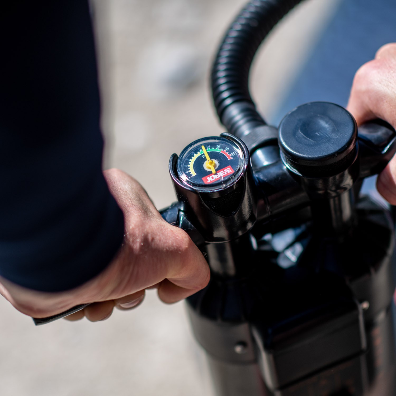 Questa pompa per SUP a tripla azione della Jobe è stata progettata per gonfiare i SUP fino a una pressione pari a 20 PSI in modo facile e veloce. È dotata di due cilindri a doppia azione da 3,5 litri ciascuno, un manometro, e una valvola Halkey Roberts, compatibile con tutte le tavole gonfiabili della Jobe in circolazione sul mercato. Questa pompa per SUP a tripla azione della Jobe ha tre diverse modalità di funzionamento per facilitare il gonfiaggio in qualsiasi circostanza: La doppia azione a 2 cilindri gonfia rapidamente il SUP fino a 5 PSI. L’azione singola a 2 cilindri consente di gonfiare il SUP a una velocità media, e fino a 10 PSI. L’azione singola a un 1 cilindro permette, infine, di gonfiare con il minimo sforzo il SUP fino a un massimo di 21 PSI.