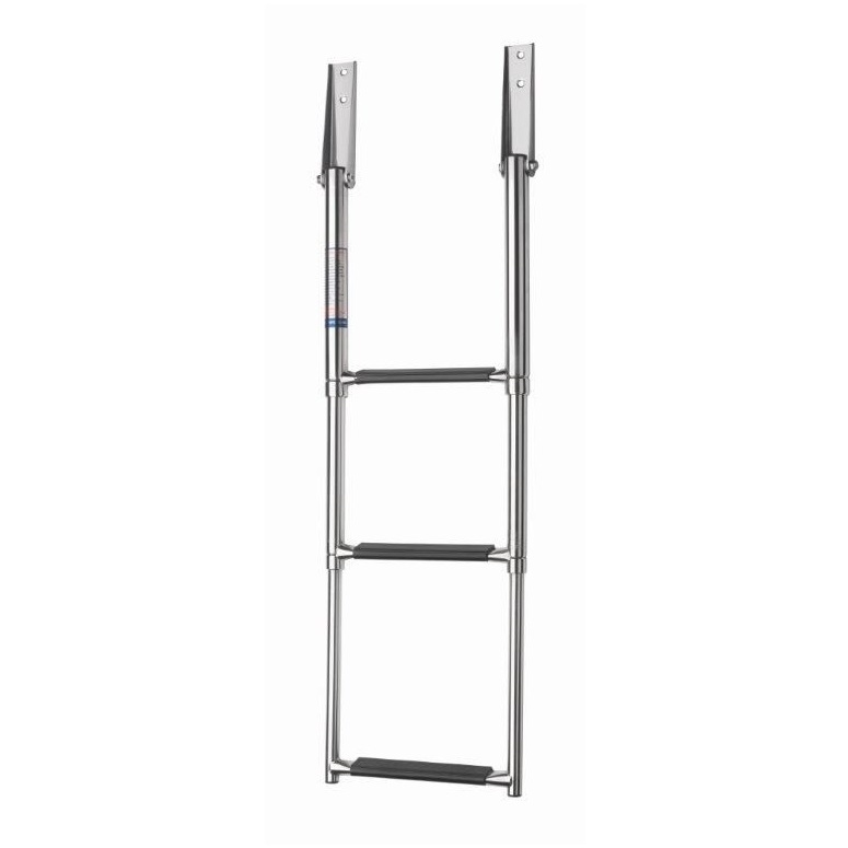 Scaletta telescopica larga in acciaio inox (AISI316) anodizzato lucido con 3 gradini, con rivestimento antiscivolo sintetico nero.