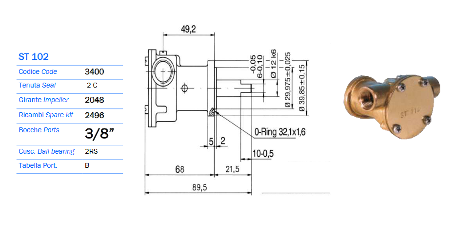 Pompa Autoadescante in bronzo, con girante in neoprene per raffreddamento motori, bocche da 3/8.