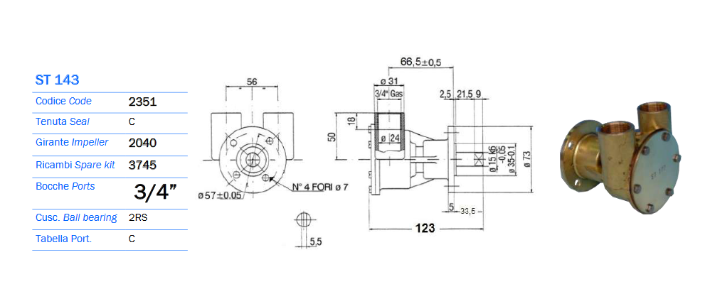 Pompa Autoadescante in bronzo, con girante in neoprene per raffreddamento motori, bocche da 3/4.