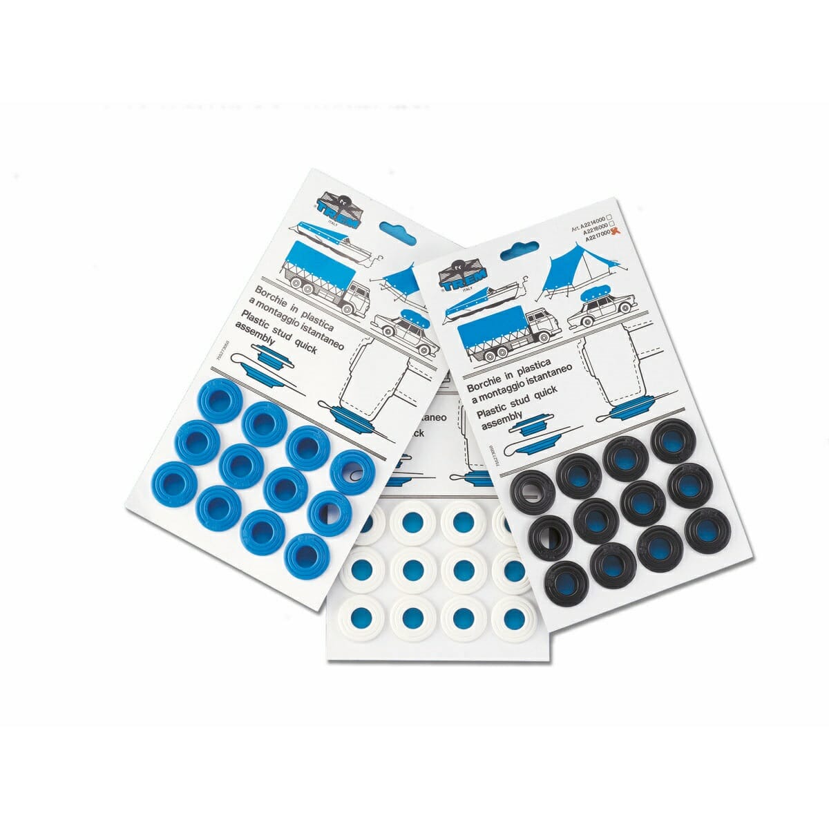 Borchie di plastica a montaggio rapido, indicate per occhiellare teloni, tende ecc.