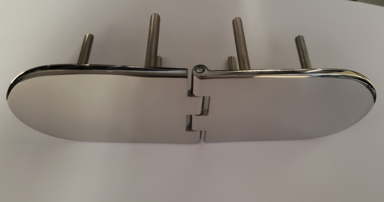 Cerniera a doppia coda in acciaio inox Aisi 316 microfuse con perni inferiori di fissaggio di diametro Ø 6 mm, lunghezza 50 mm, Apertura 100° .
