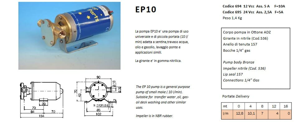Pompa autoadescante di uso universale e di piccola portata ( 10 L/min ) adatta a sentina, travaso acqua, olio e gasolio, lavaggio ponte e applicazioni simili. La girante e’ in gomma nitrilica , bocche da 1/4.