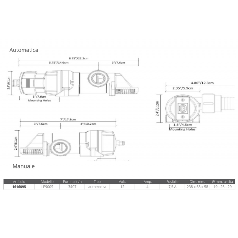 Pompa di sentina a basso profilo per spazi ristretti e difficilmente accessibile. Ha la possibilita’ di ruotare il corpo di 180°. Completa di valvola di non ritorno. La pompa incorpora un rilevatore elettronico di acqua e un temporizzatore che le consentono di funzionare in tre modalita: