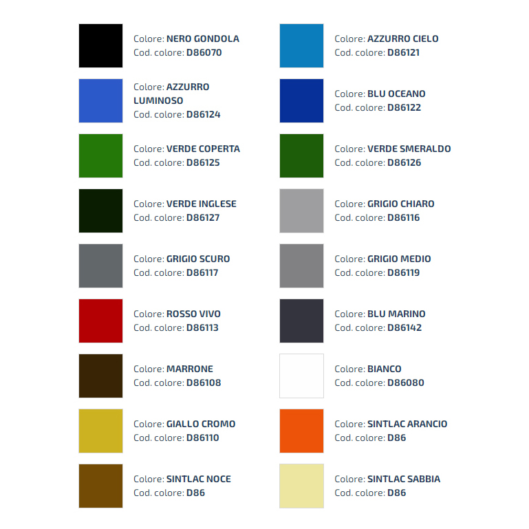 | Colore | Grigio Medio 119, Azzurro Cielo 121, Azzurro Luminoso 124, Bianco 080, Blu Oceano 122, Giallo Cromo 110, Marrone 108, Noce 104, Grigio Scuro 117, Sabbia 100 |