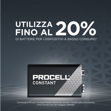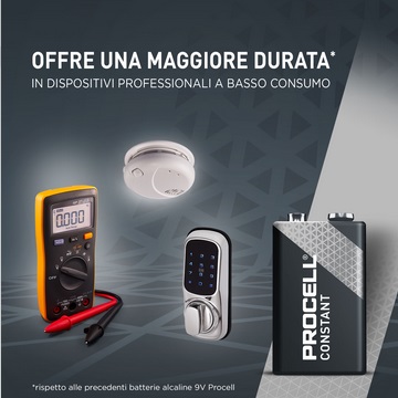 Le batterie alcaline 9V (6LR61) Procell Constant Power sono progettate per offrire prestazioni elevate in dispositivi professionali, come i rilevatori di fumo/monossido di carbonio.