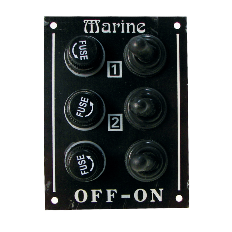 Pannello elettrico in alluminio nero con interruttori a leva protetti da cappuccio in gomma e portafusibile con fusibile in vetro da 5 Amp. Dimensioni 95x70mm.