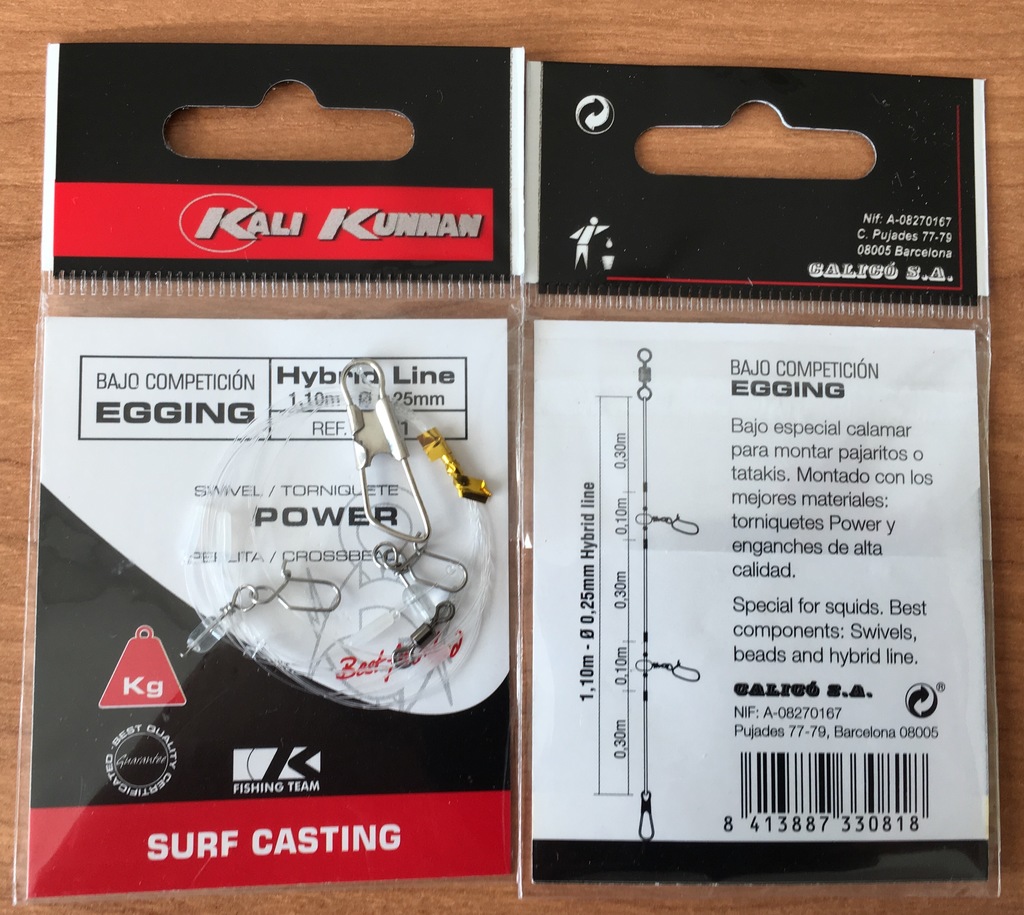 Montatura pronta per la pesca a Tataki, composta da due moschettoni di aggancio distribuiti su uno spezzone lungo 1,10mt di monofilo da Ø 0.25mm.