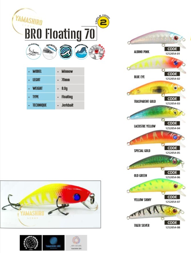 Il Minnow Yamashiro Bro Floating 70, è realizzato per essere utilizzato sia in mare che in acque interne e fiumi e’ adatto sia alla pesca a spinning che alla pesca a traina e traina costiera. Un’artificiale dalle grandiose qualità.