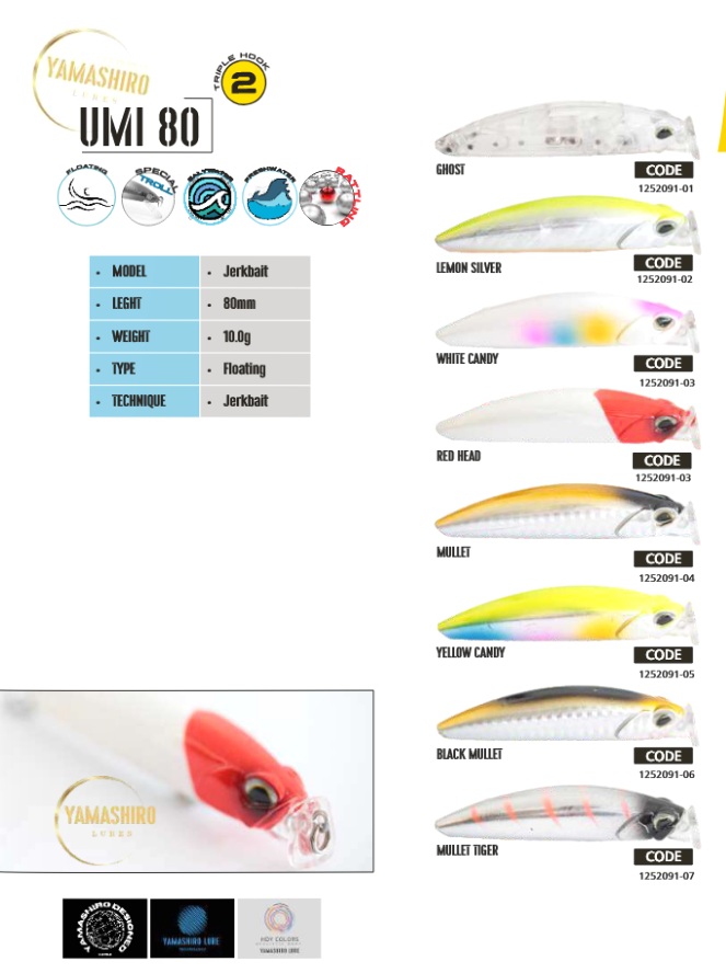 Yamashiro Umi 80 e’ un artificiale da pesca super aerodinamico, estremamente vivace durante il recupero, particolarmente indicato per spigole serra e barracuda.