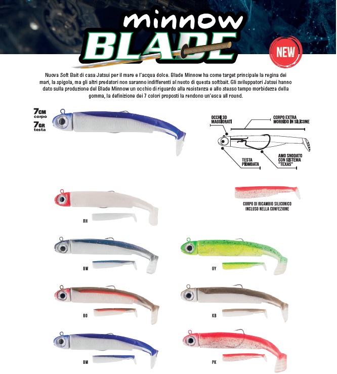 Gli sviluppatori Jatsui hanno dato sulla produzione dei Blade Minnow un occhio di riguardo alla resistenza e allo stesso tempo morbidezza della gomma, la definizione dei colori proposti la rendono un’esca all round.