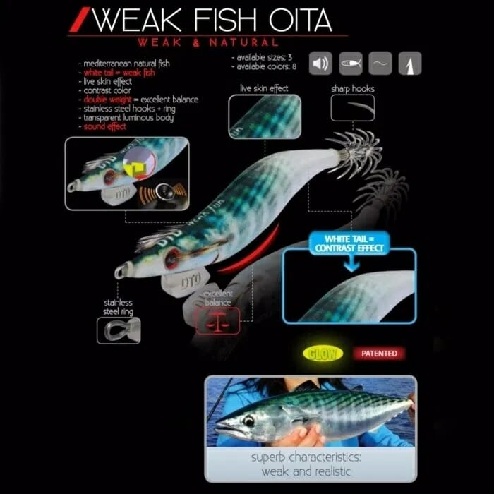 La totanara Weak Fish Oita nasce con un’idea semplice ma funzionale. Tutti i modelli hanno la coda bianca questo la rende molto catturante perchè crea un contrasto tra la parte del corpo e il resto del pesciolino e in acqua produce molti riflessi.