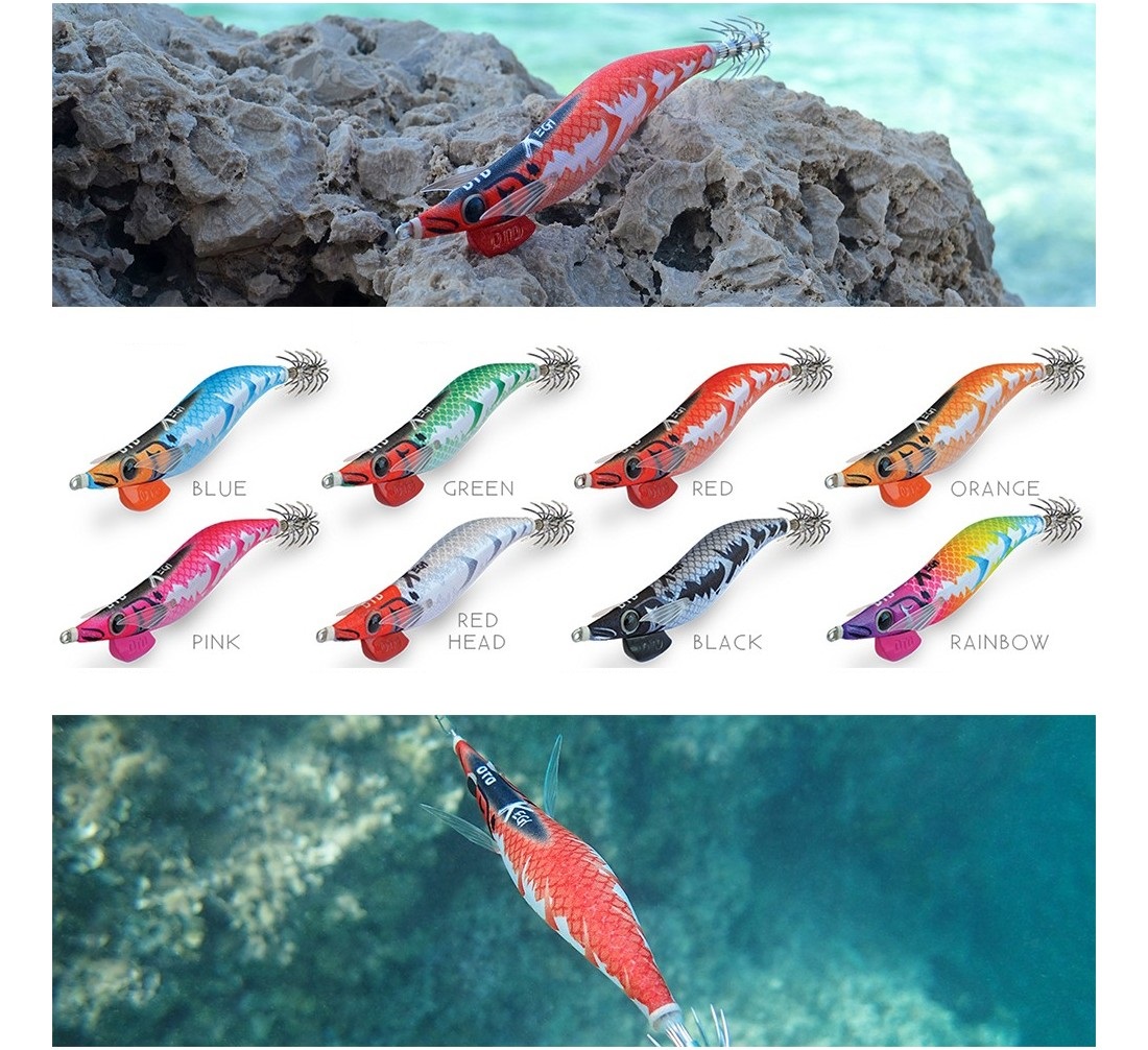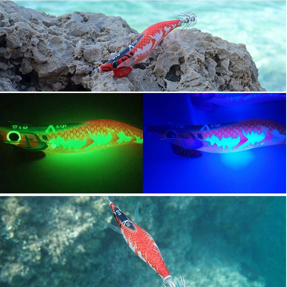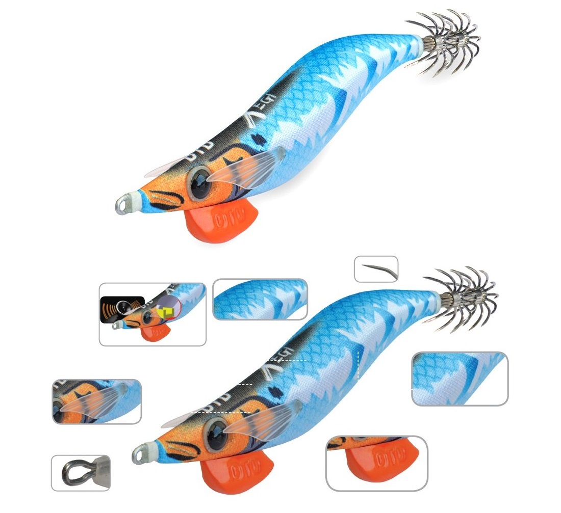 Ai lati dell’Egi è presente un vivido motivo bianco che interrompe la colorazione di base creando un forte contrasto, tale da rendere ben visibile l’artificiale ai Cefalopodi.