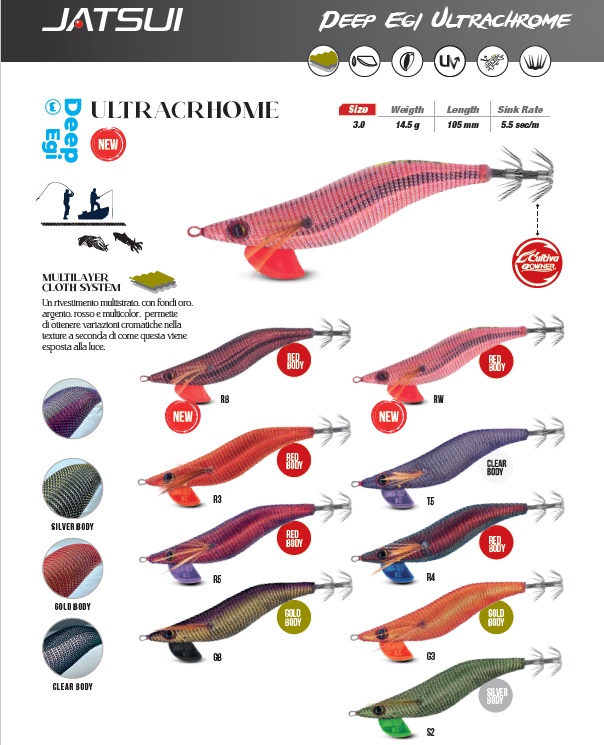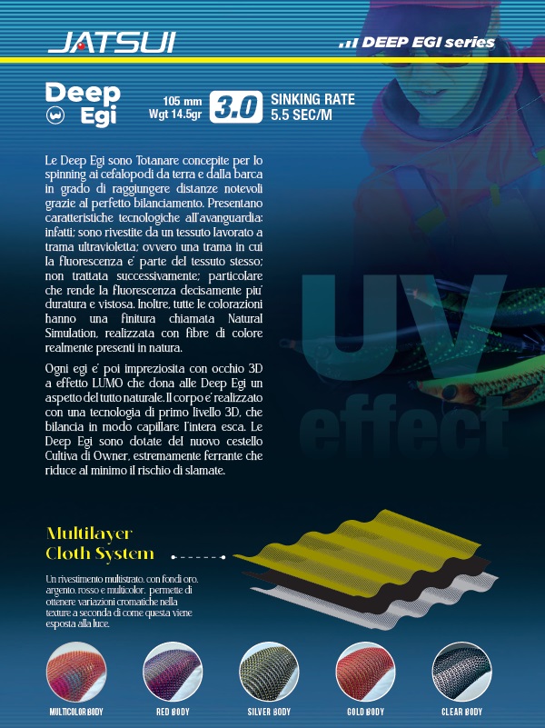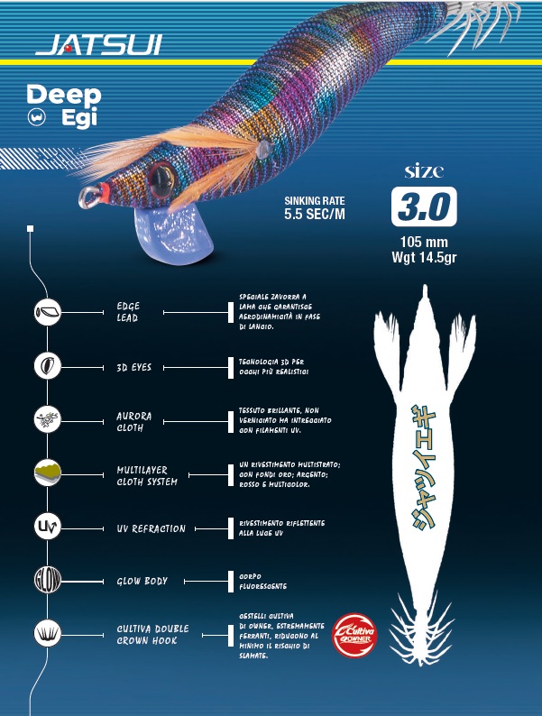 Le Deep Egi sono totanare concepite per lo spinning ai cefalopodi sia da terra che dalla barca, in grado di raggiungere distanze notevoli grazie al perfetto bilanciamento.