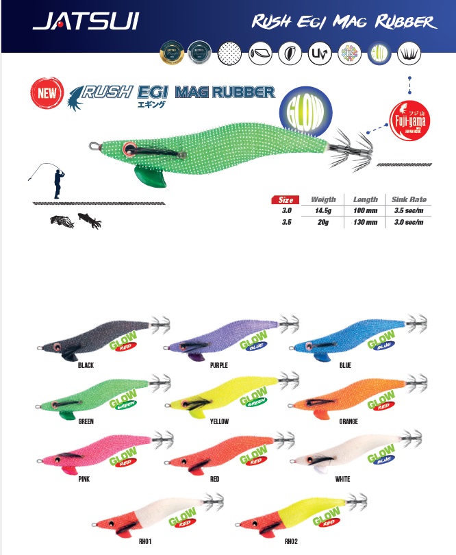 Dalla combinazione della tecnologia Jatsui Mag e Jatsui Rubber Cloth, nasce la serie Jatsui Rush Egi Mag Rubber, che vede applicate alle totanare il sistema di bilanciamento magnetico in combinazione con il rivestimento siliconico Jatsui Rubber, al fine di creare un bellissimo crossover a cui si aggiunge la combinazione di colori espansa in modalita’ glow quando sottoposta all’illuminazione delle lampade artificiali.