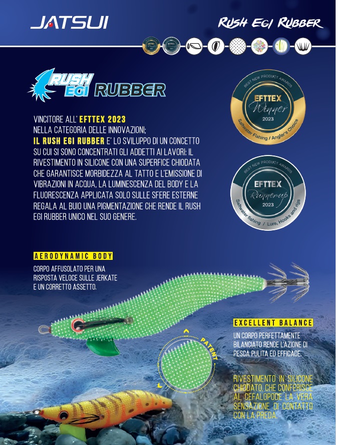 Vincitore all’Efttex 2023 nella categoria delle innovazioni , il Rush Egi Rubber e’ lo sviluppo di un concetto su cui si sono concentrati gli addetti ai lavori: il rivestimento in silicone con una superficie chiodata che garantisce morbidezza al tatto e l’emissione di vibrazioni in acqua, la luminescenza del corpo e la fluorescenza applicata solo sulle sfere esterne regala al buio una pigmentazione che rende il Rush Egi Rubber unico nel suo genere. Aerodynamic Body: Corpo affusolato per una risposta veloce sulle jerkate ed un corretto assetto. Excellent Balance: Un corpo affusolato bilanciato rende l’azione di pesca pulita ed efficace. Rivestimento in silicone chiodato, che conferisce al cafalopode la vera sensazione di contatto con la preda.