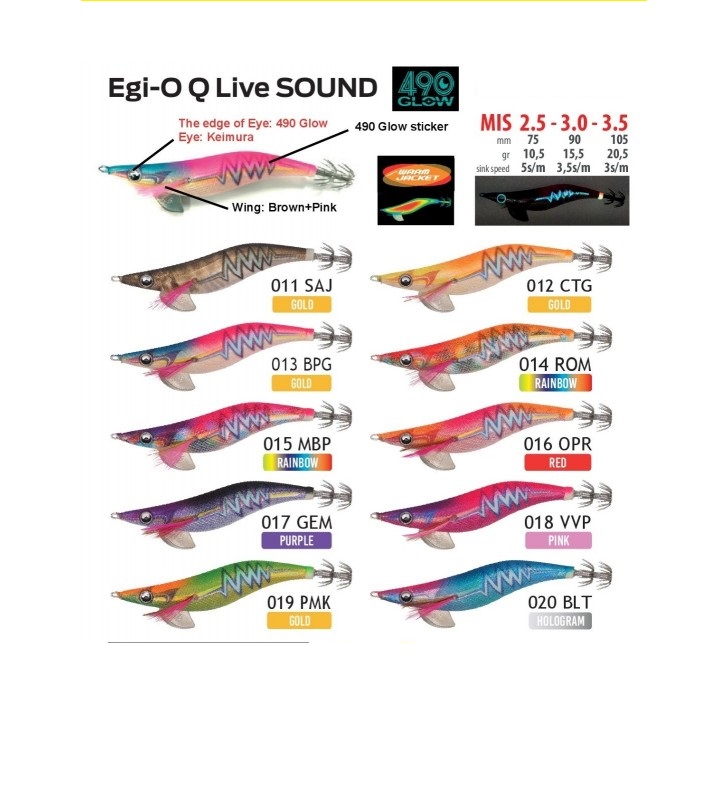 Anche in questo caso vi sono state molte prove di laboratorio per scoprire se vi fosse un’emissione sonora che riuscisse a suscitare più delle altre la curiosità o l’aggressività delle seppie; e sono appunto i risultati di queste ricerche che hanno selezionato il suono che è possibile udire scuotendo un Egi O Q Live Sound.