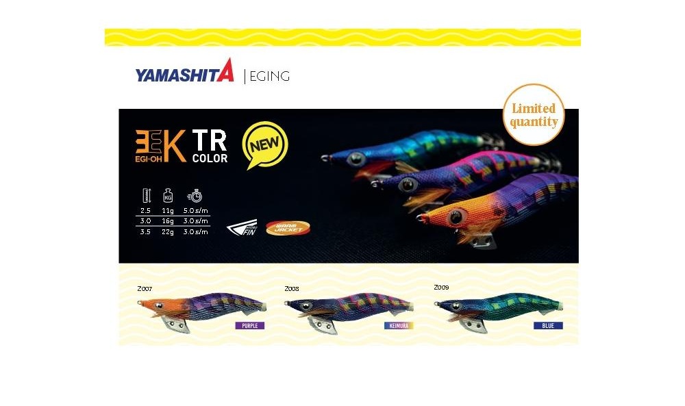 La Egi-OH K “TR Limited Colors” della Yamashita è una serie limitata di 3 colorazioni della Egi-OH K, nate per offrire ai pescatori di un vantaggio reale nelle condizioni più impegnative. Basati sulla struttura collaudata dell’Egi-OH K, famosa per la sua stabilità , sensibilità e capacità di attirare calamari poco attivi, questi tre nuovi colori sono stati studiati per garantire la massima efficacia durante la pesca in profondità e con forti correnti.