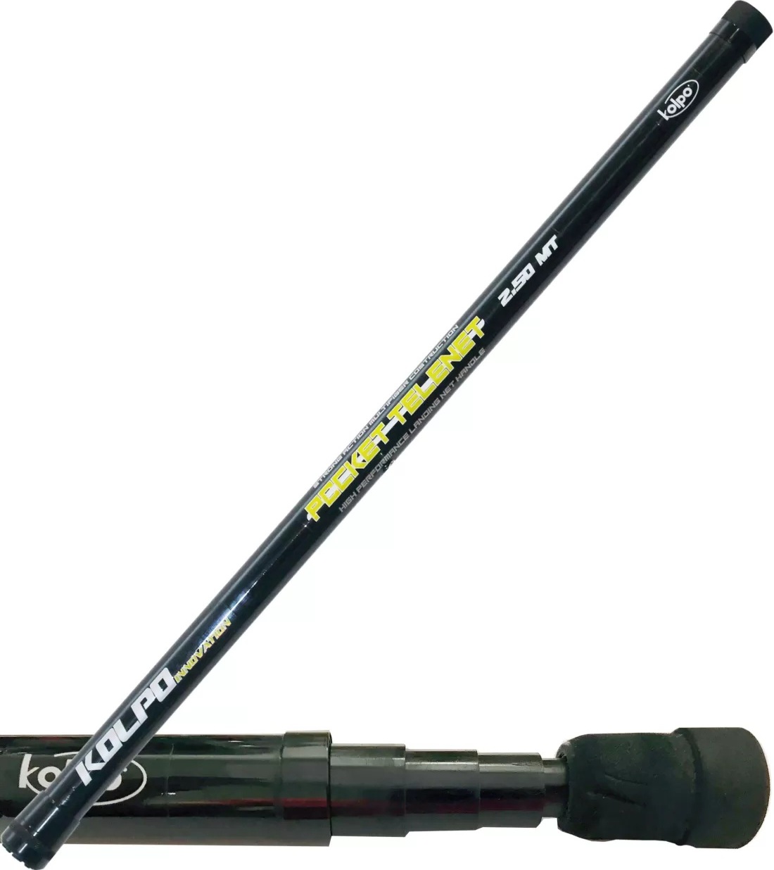 Il guadino telescopico da pesca, Kolpo Pocket Tele Net misura solo 61 cm chiuso, si allunga fino a 250 cm, il tappo è stato eliminato e sostituito da un pratico galleggiante che funge anche da chiusura.