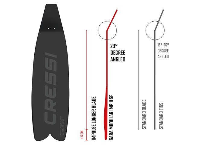 La pala della gara modular impulse completa la gamma delle pinne Cressi, inserendo un angolo di curvatura di 29 gradi, che permette di aumentare ulteriormente le prestazioni dinamiche della pinna.