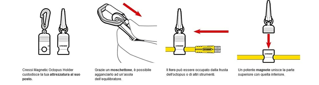 Cressi Magnetic Octopus Holder custodisce la tua attrezzatura al suo posto, accanto all’equilibratore. È formato da due parti collegate tramite un potente magnete. Il foro può essere occupato dalla frusta del tuo octopus, da quella del manometro, del profondimetroo di altri strumenti. È la soluzione ideale per evitare che gli strumenti si muovano senza controllo, scongiura il pericolo di rottura e permette di collocare ogni elemento nella posizione più opportuna.