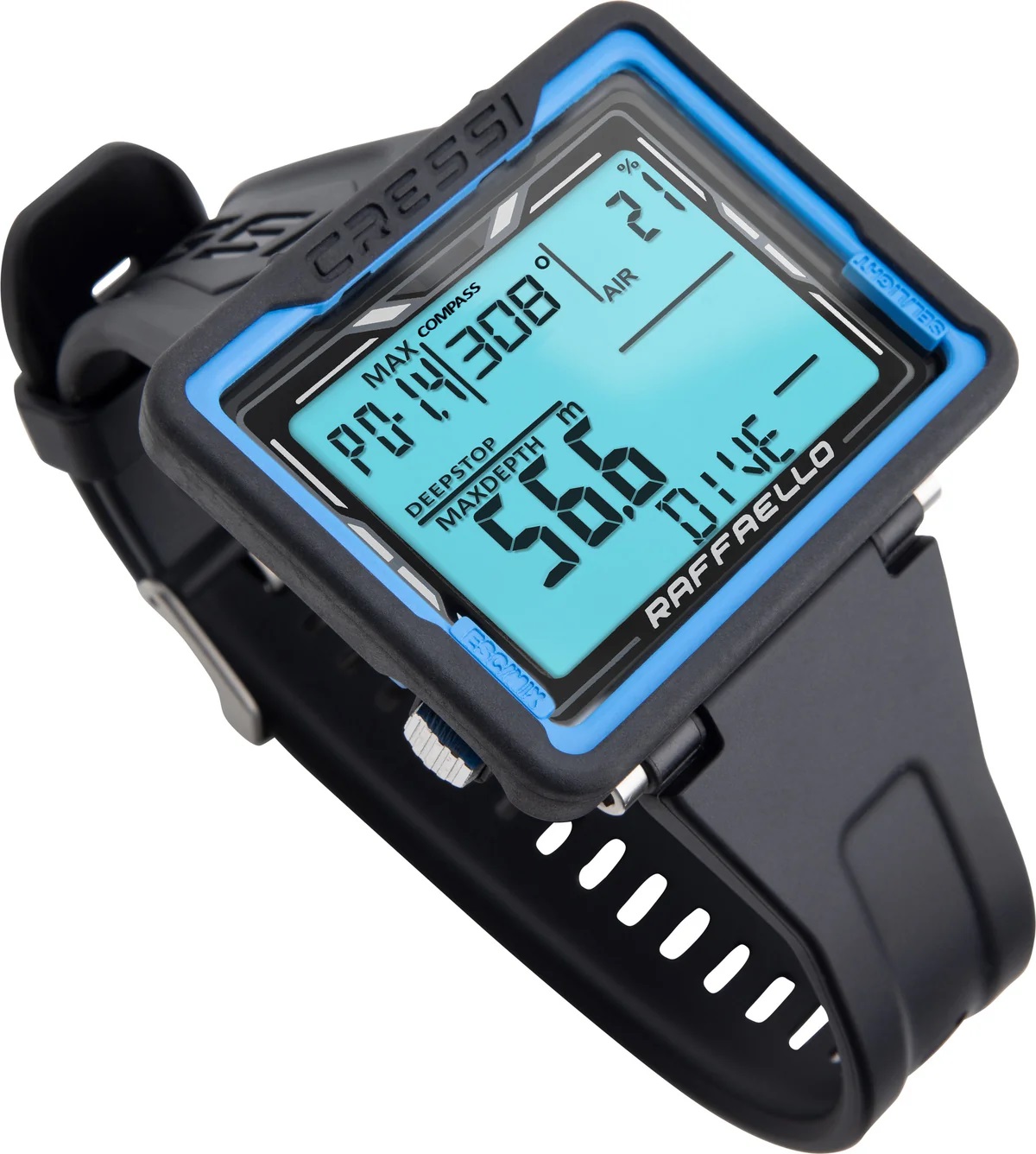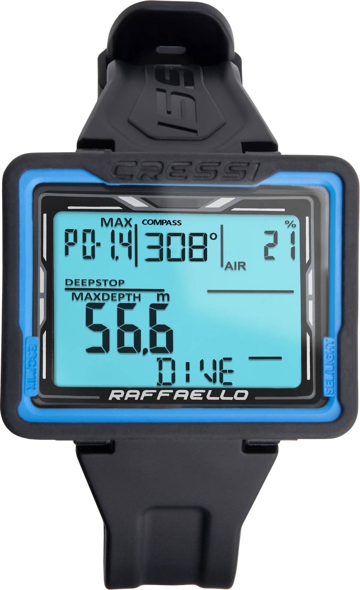 Raffaello è un computer subacqueo con un corpo durevole e resistente ai graffi e un ampio display di facile lettura.