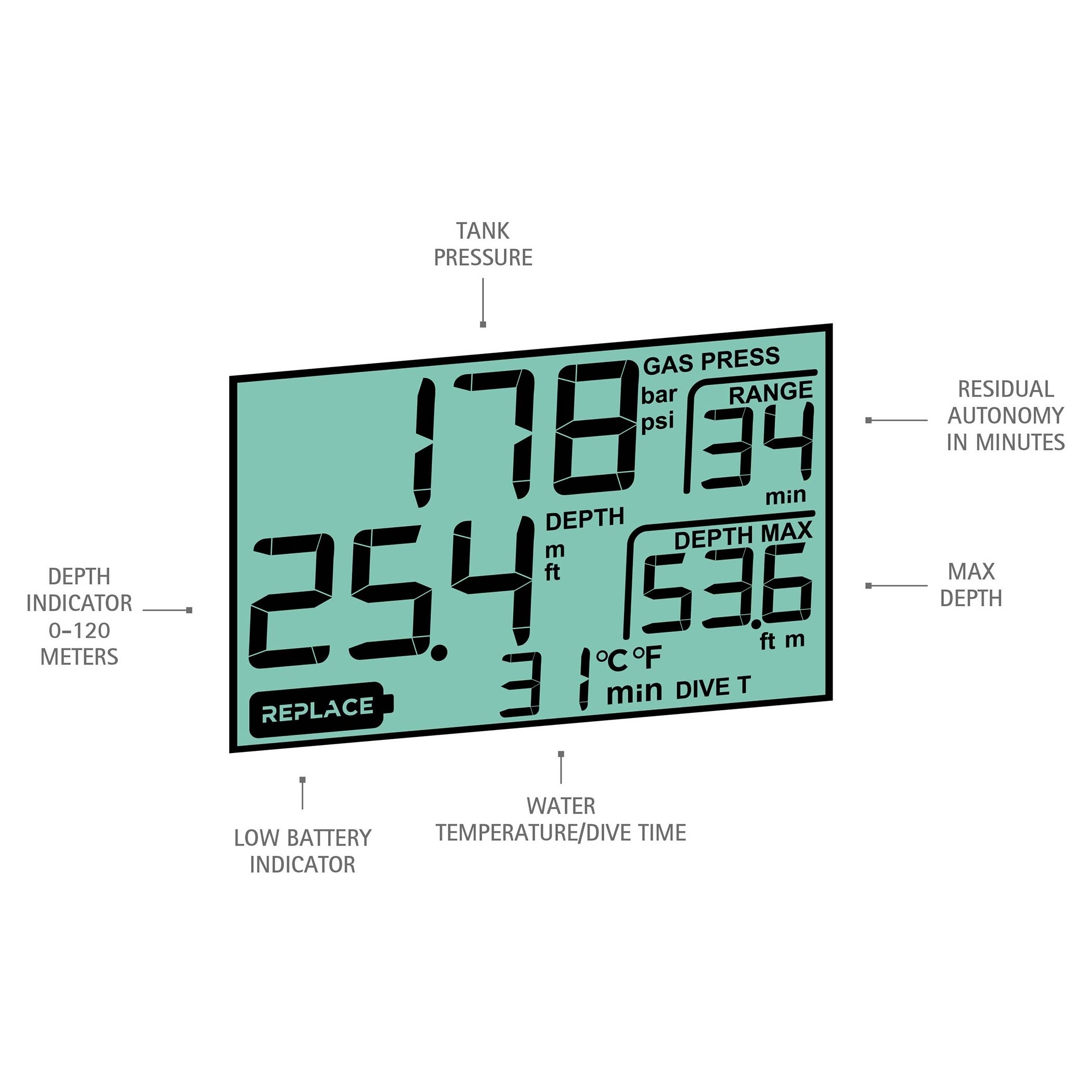 Dagli indicatori di profondita’ da 0 a 120 metri agli indicatori di pressione bombola da 0 a 300 bar, fornisce dati completi per prendere decisioni consapevoli.