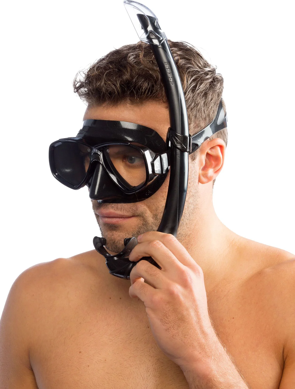 Modello di aeratore cressi, dotato di un tubo flessibile e sagomato, che si adatta ottimamente alle diverse fisionomie facciali.